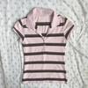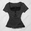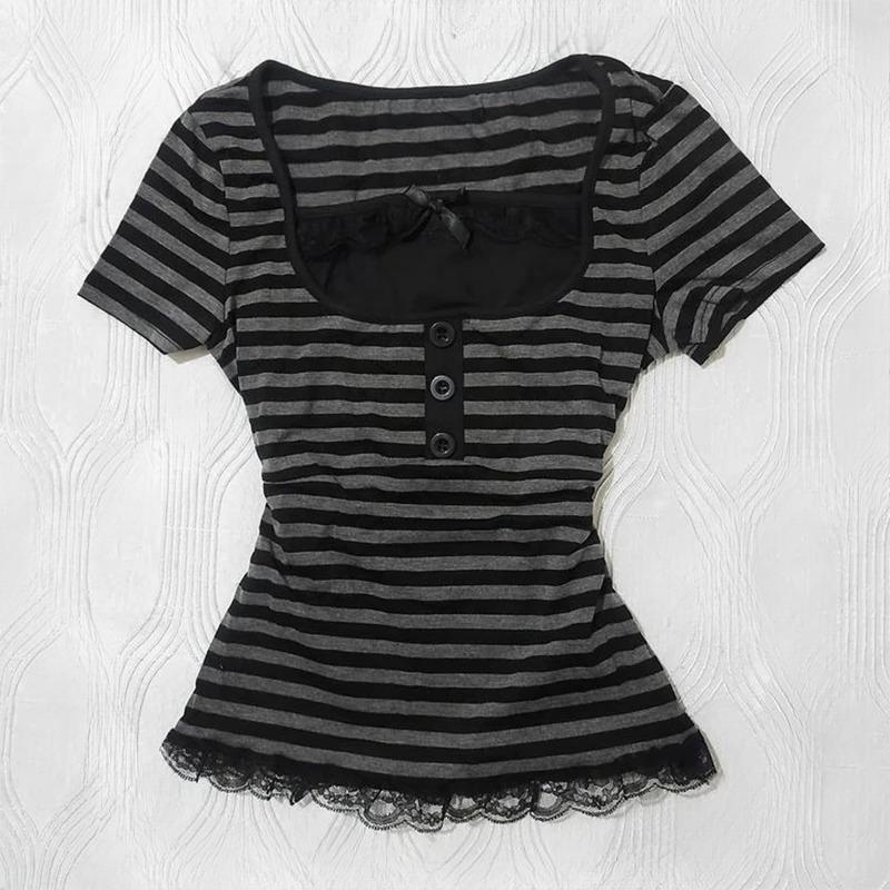 TrendHub Gothic Harajuku Y2K Women's Crop Top Casual Slim Fit Striped Lace Bow Button Design Short Sleeve T-Shirt Chic Trendy Streetwear