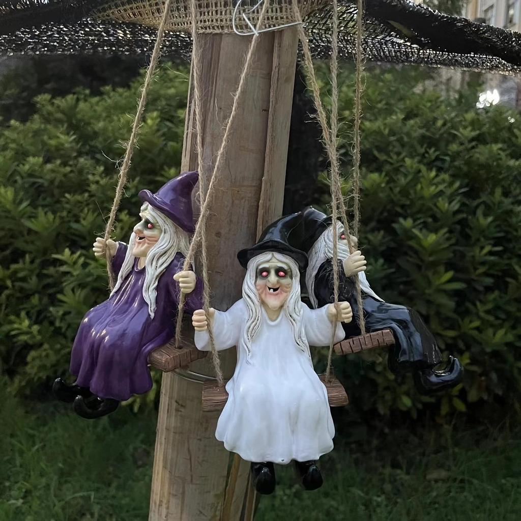 Ghost and Witch Pendant Set: Black-Clad Ghost Swing, White-Clad Ghost with Cat, Purple-Clad Witch for Courtyard & Garden Decor
