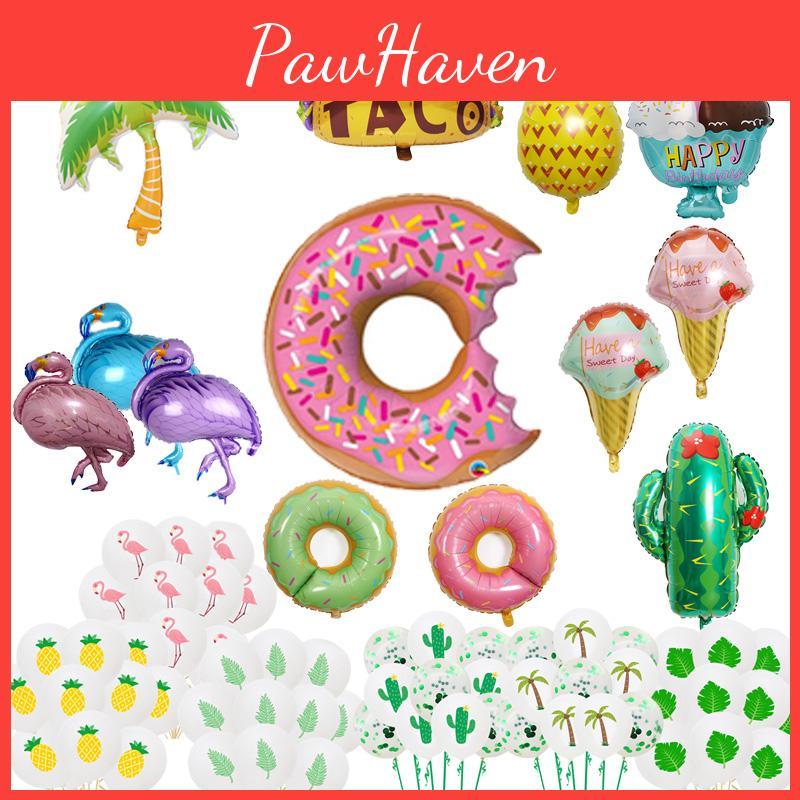 Size: Blue:105x51cm/41.34*20.08in, Purple And Pink:97x56cm/38.19*22.05in, Coconut Tree:90x80cm/35.43*31.5in, Cactus:63x73cm/24.8*28.74in, Donut:75x70cm/29.53*27.56in, Pineapple:48x80cm/18.9*31.5in, Pink Ice Cream, Green Ice Cream, 10 Flamingo Latex Balloons, 10 Pineapple Latex Balloons, 10 Turtle Leaf Latex Balloons, 10 Banana Leaf Latex Balloons, Mexican Cake, 15 Cactus Sequin Set, 15 Coconut Tree Sequin Ball Set, Straw Ice Cream Balloon