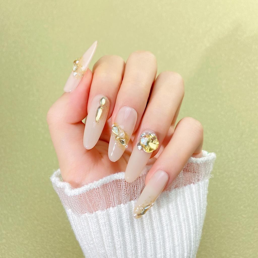 Luxurious French Gold & Diamond Press-On Nails: Elegant High-End Skin-Whitening Style, Trending Manicure Fashion