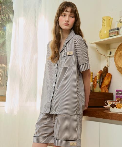 [Pink Zone] Luna Stripe Ash Short-Sleeve Collar Two-Piece Pajamas Set [Shipped from Korea] 100% Authentic