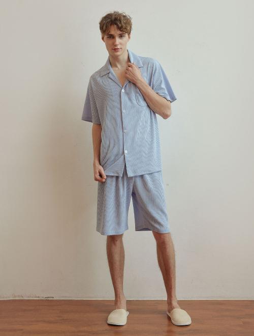 Experience unparalleled comfort with this men's two-piece pajama set, designed for an ergonomic fit and high-performance breathability. Crafted from an attractive ribbed stretch fabric, it offers exceptional elasticity and a soft touch, ensuring maximum comfort. The crisp pocket collar style and standard fit create a timeless silhouette, while the vertical ribbed lines provide a subtly slimming effect. Made with 100% domestic Korean quality in material, design, and stitching.