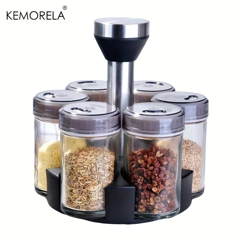 KEMORELA 360° Rotating Spice Bottle Set Glass Seasoning Storage Rack for Salt Sugar Pepper Kitchen Organizer