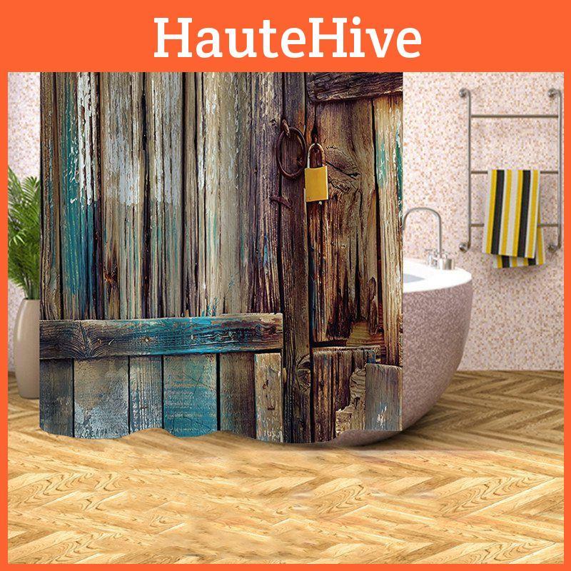 Rustic Curtain Shower Wood Barn Door Pattern Bath Curtain Waterproof With Hooks