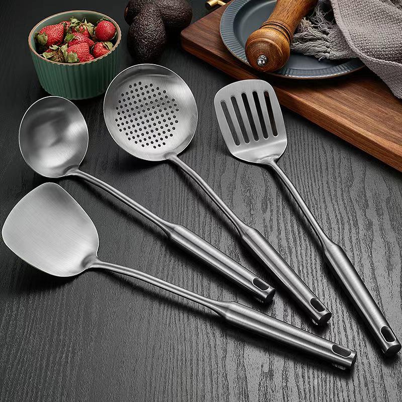 304 Stainless Steel Kitchen Utensil Set: Hollow Handle Spatula, Frying Pan Spatula, Flour Sieve, Soup Ladle, Hot Pot Ladle, Slotted Spoon.