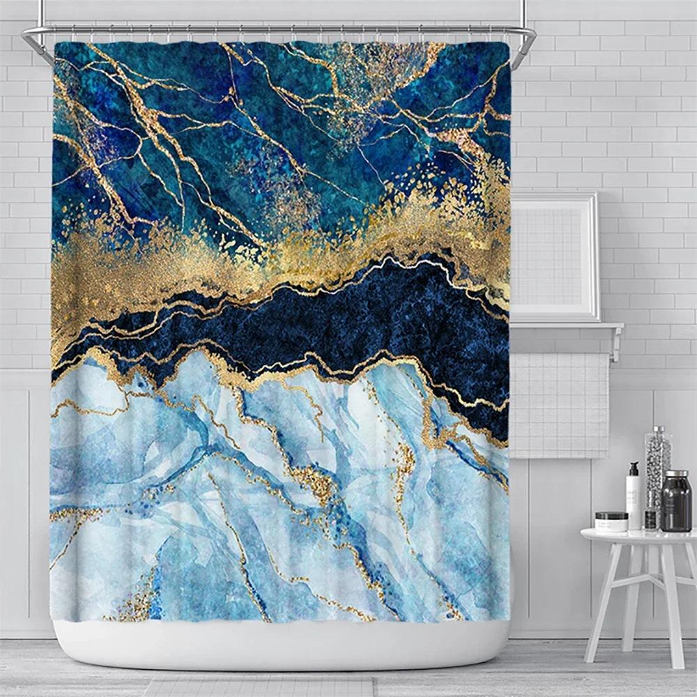 Abstract Navy Blue Gold Marble Shower Curtain Modern Luxury Golden Cracked Lines Fabric Bathroom Curtain Fashion Decor with Hook