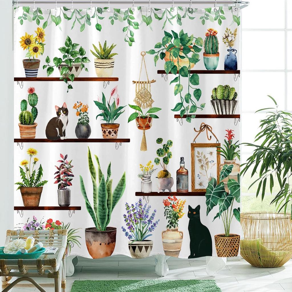 Plants Cat Shower Curtain Cute Shower Curtain for Bathroom with 12 Hooks Polyester Fabric Waterproof Shower Curtains for