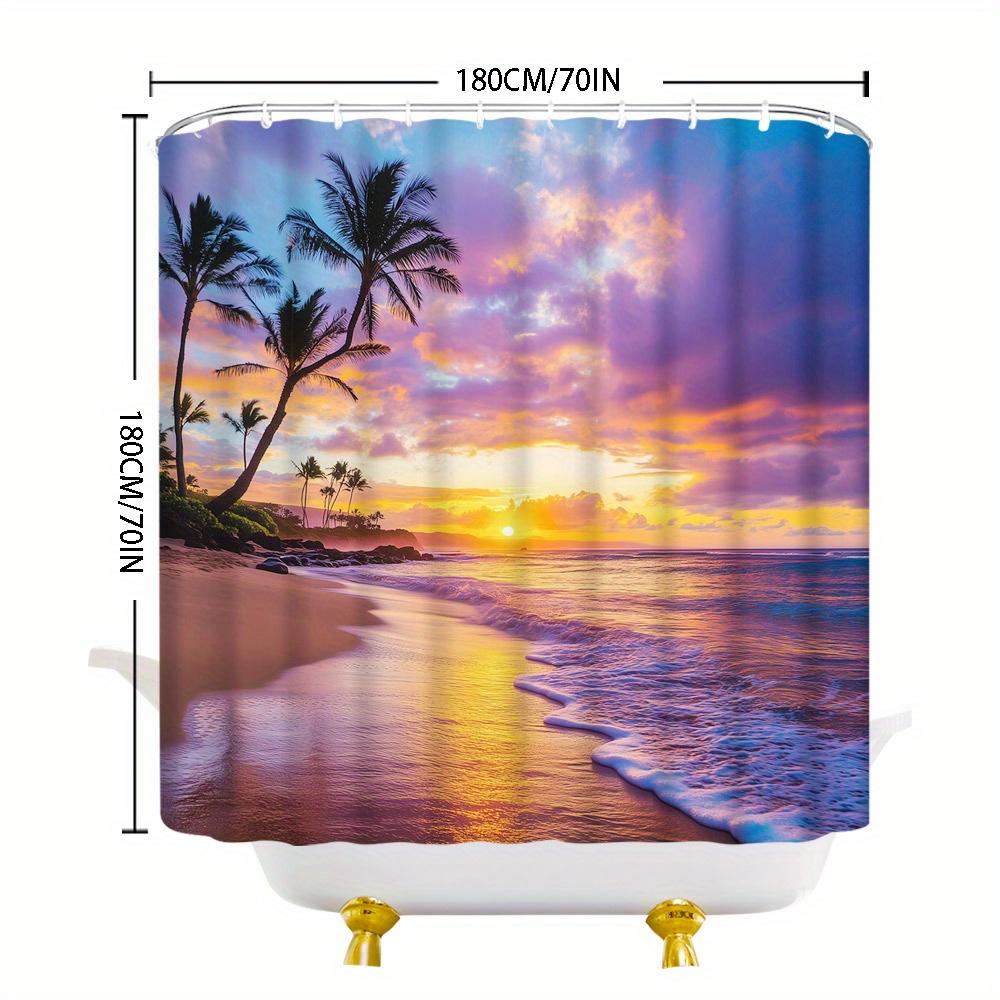 Tropical Beach Sunset Shower Curtain - Palm Trees, Waves, Washable Polyester with Hooks