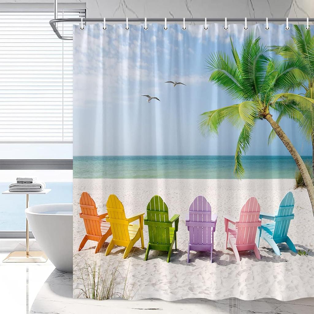 Ocean Scenic Shower Curtain Colorful Beach Chairs Funny Bathroom Curtains Tropical Nature Landscape Summer Palm Tree Hawaiian