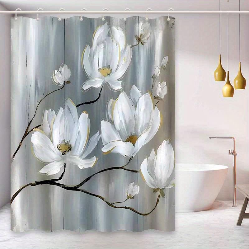 Simple White Magnolia Flower Pattern Shower Curtain - Polyester Fabric, Machine Washable, with Hooks Suitable for Bathroom Decor