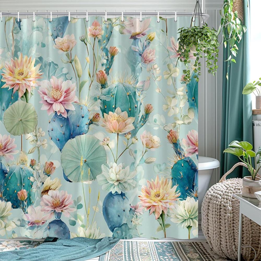 1pc Floral Shower Curtain with Cacti & Water Lily Design - 70.8x70.8 Inch Polyester Fabric Bathroom Decor, Mint Green Botanical