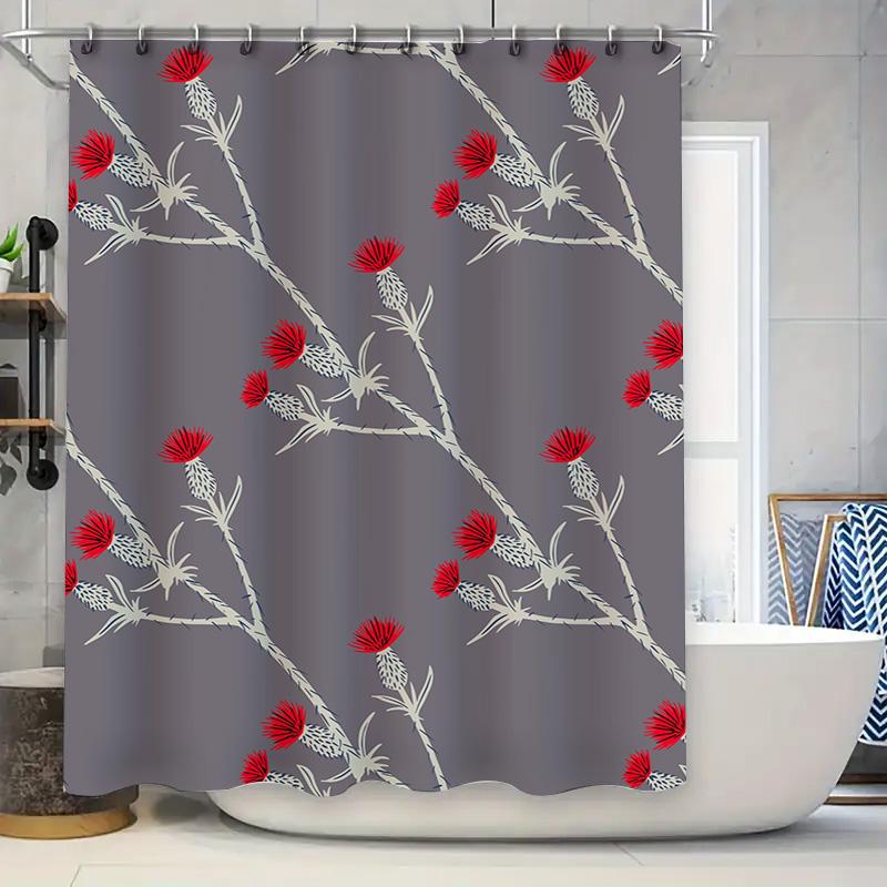 Modern Floral Print Shower Curtain Gray Red Thistle Design for Bathroom Decor Custom Size Available