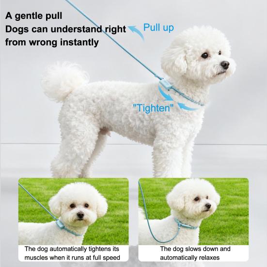 Innovative Double Limit Buckle & P Chain System: Equipped with a unique double limit buckle combined with a P chain structure, the leash automatically tightens gently when the dog rushes forward, correcting behavior without choking or causing distress. It relaxes when the dog slows down, ensuring comfort while maintaining effective training and daily walking functionality.