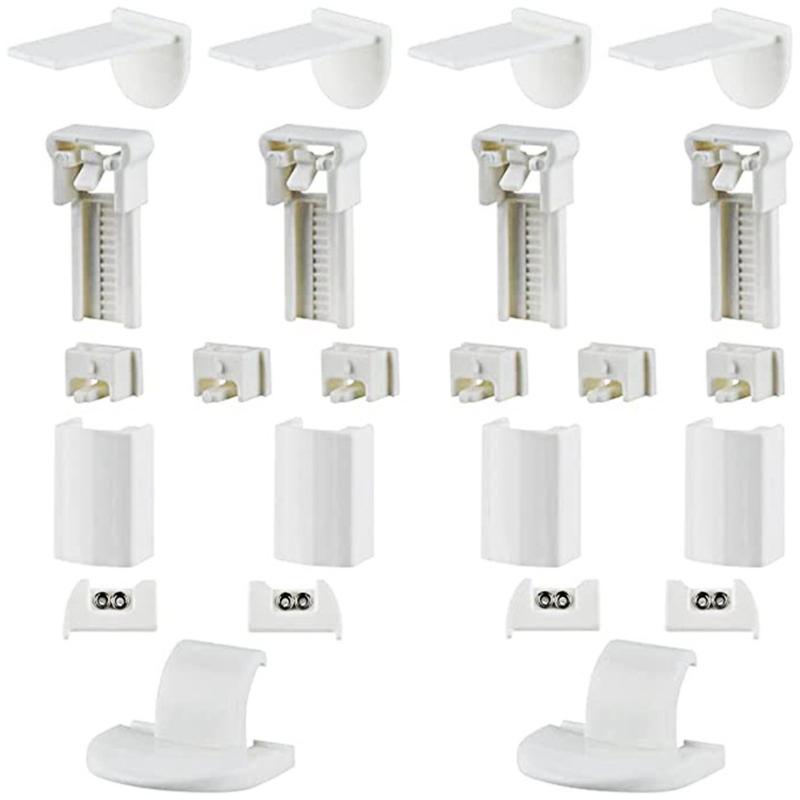 Each set includes 4 complete kits (24 parts total) of lightweight yet sturdy plastic fixtures designed specifically for securing blinds and curtains without drilling or tools.