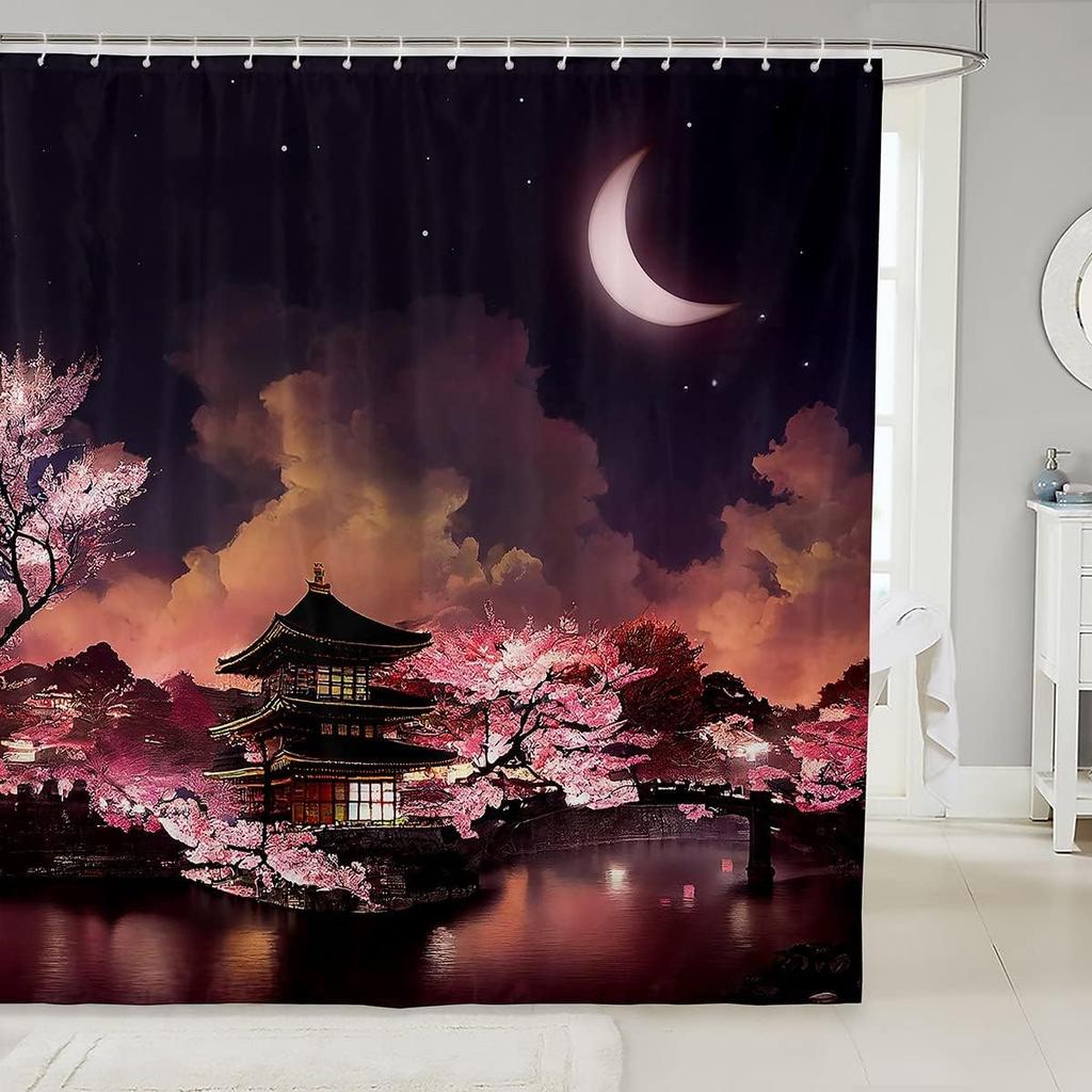 Japanese Style Moon Cherry Blossom Shower Curtain - Romantic Night Sky Scenery Bathroom Decor Women - Exotic Pink Waterproof