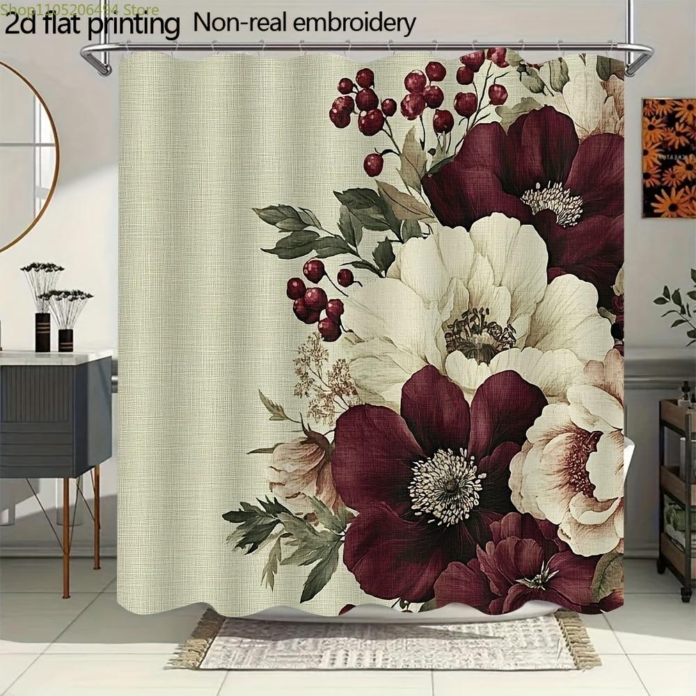 1pc 71x71 Inch Floral Shower Curtain - Large Burgundy & Cream Flowers with Green Leaves, Machine Washable Polyester, Elegant B