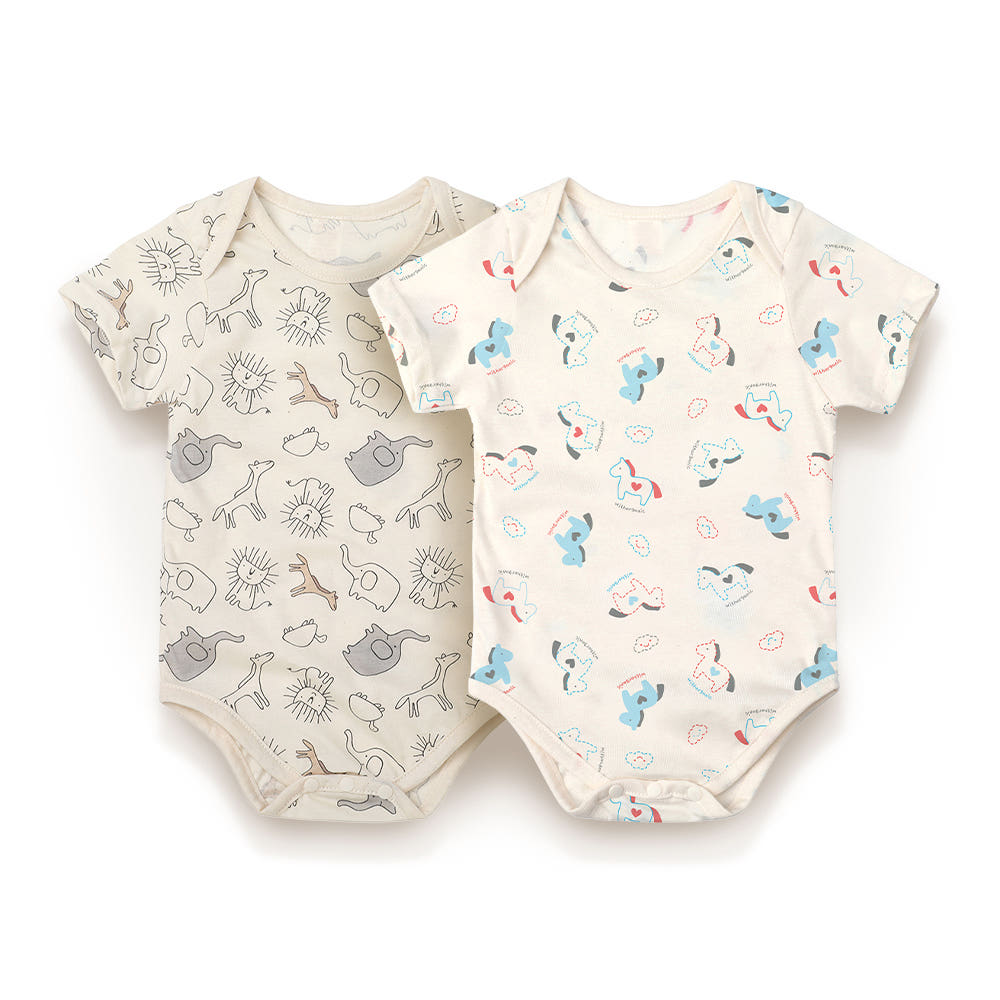 The Withorganic Organic Cotton Newborn Bodysuit 2-Piece Set is a professional-grade, essential clothing duo specifically engineered for the daily comfort and mobility of infants. This curated set features one "Cloud Heart Horse" edition bodysuit, characterized by its dreamy horse and cloud motif, and one "Momo's Forest" edition featuring a whimsical nature-inspired print for a soft and poetic aesthetic. Crafted from 100% GOTS-certified organic cotton, these bodysuits provide a professional-level safety standard that is exceptionally gentle on a newborn's sensitive skin. Designed with a convenient bottom snap closure, this set ensures effortless diaper changes while maintaining a soft, breathable environment for the baby throughout the day.