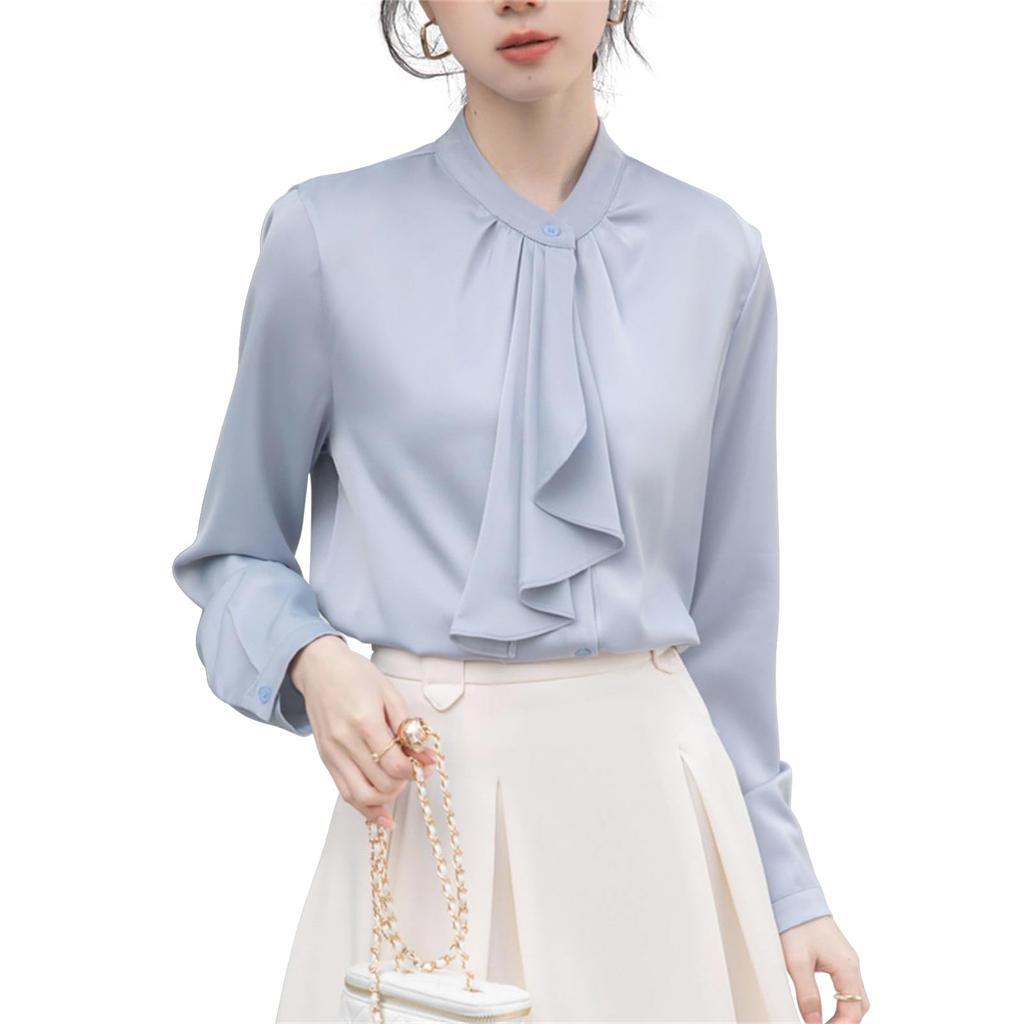 [SYitong] Women's Long-Sleeved Plain Blouse, Stylish, Washable, Collarless, White/Pink, Lined, Business/Office, Cute, Popular, Date, Outing, Commuting