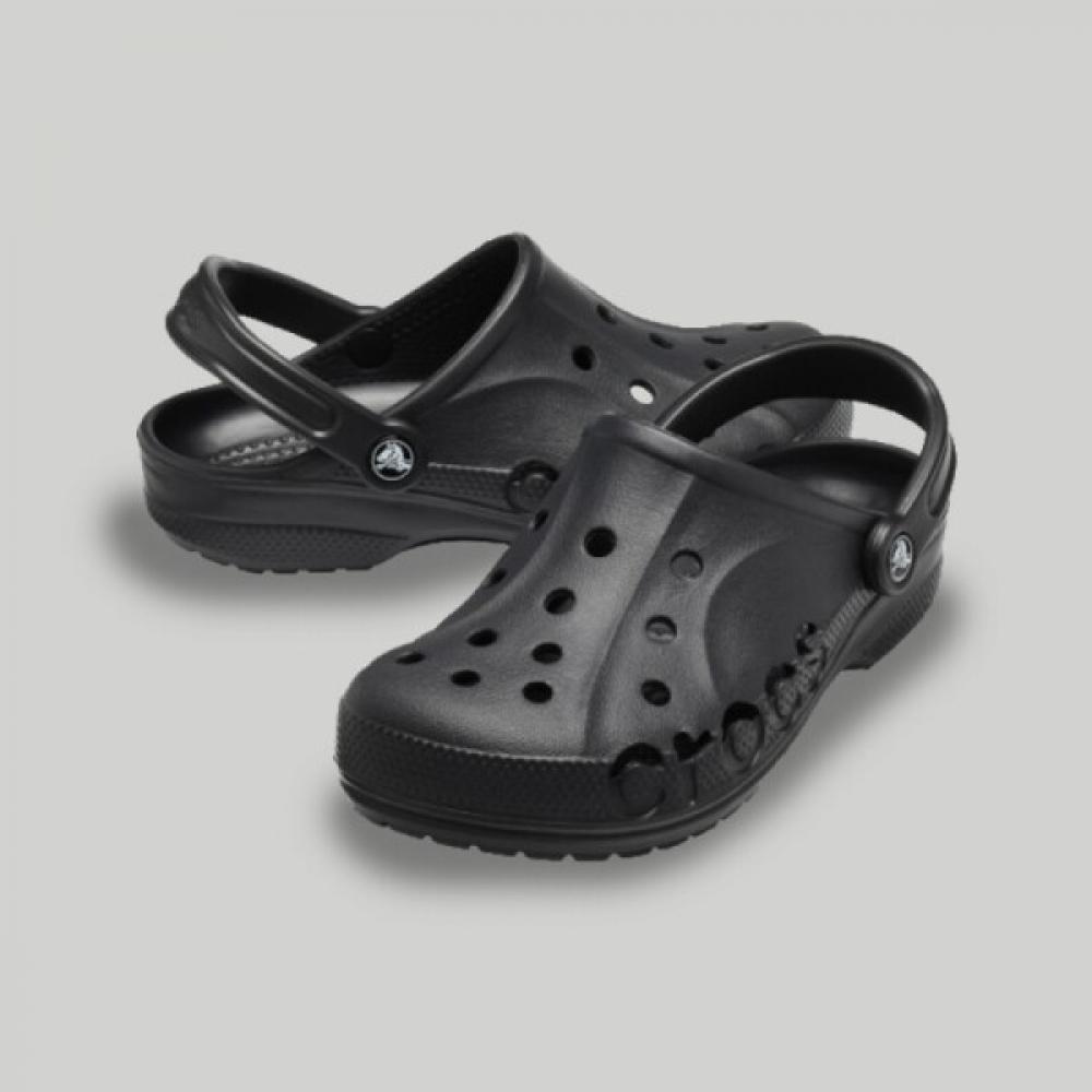 The Crocs Baya Clog Black 10126-001 is a unisex clog sandal classified as a sports slipper. Made from fully molded Croslite™ material, it is lightweight and durable. It features a toe ventilation system for excellent breathability and helps expel water and debris. A pivot strap is applied for a stable fit. It provides Iconic Crocs Comfort™ with a design for 360 degrees of comfort, suitable for everyday wear, water play, and sports activities.