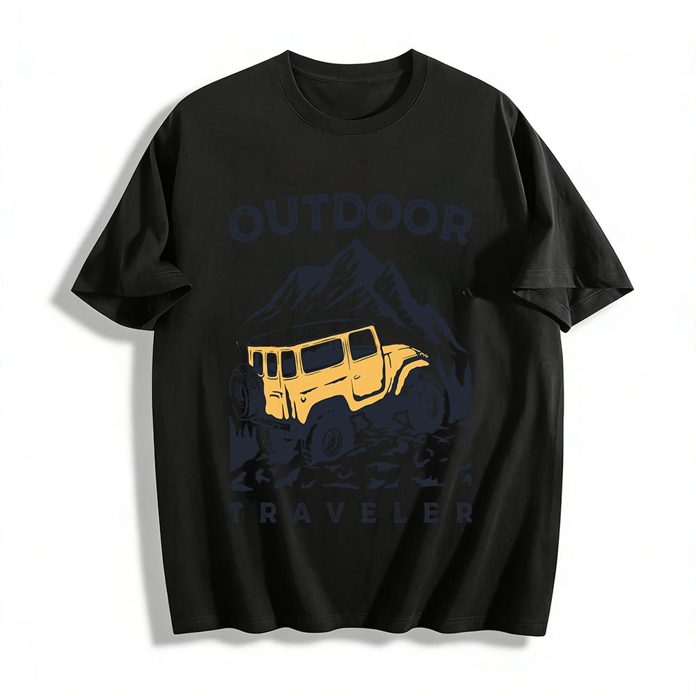 Outdoor Traveler Mountain Off-Road Graphic Retro Casual Tee Pure Cotton T-shirt