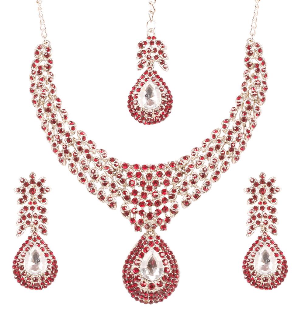 Touchstone Indian Bollywood Traditionally Marked White and Red Rhinestone Alluring Bridal Designer Jewelry Necklace Set In Silver Tones for Women.