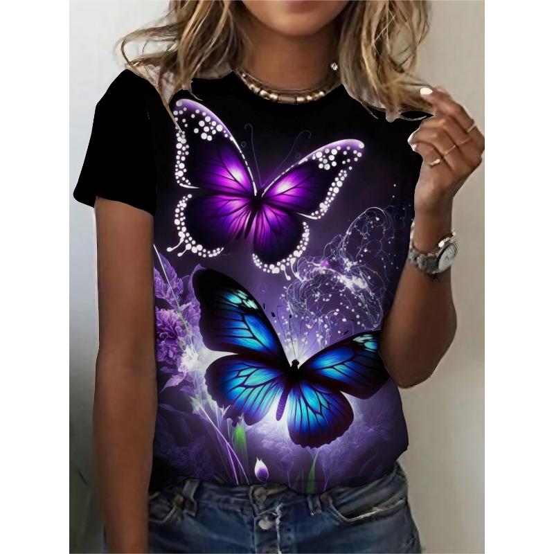 Women's T-shirt - Purple and Blue Butterfly Pattern, Suitable for Casual Daily Wear