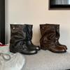 All Leather~ Belt Buckle Medium Boots British Pants Pants Martin Boots Women's Thick Heel Knight Boots Western Pile Boots