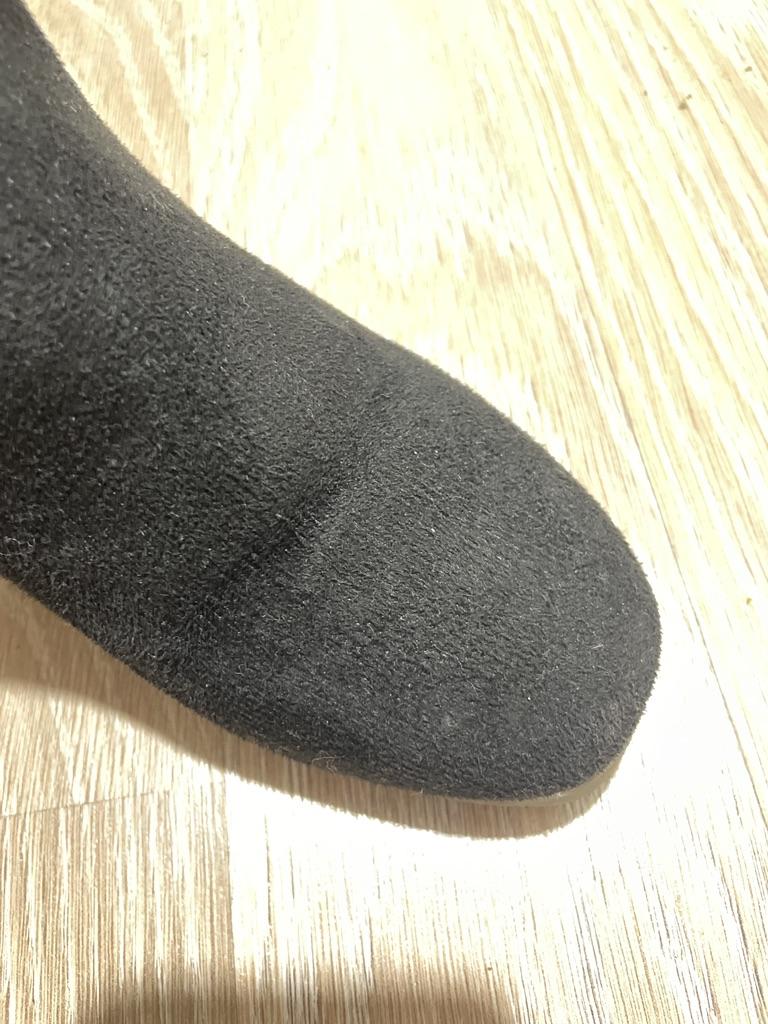 Strikken er bred, det plager fingrene og skinnet bak ser rart ut, kvaliteten lar mye å være ønsket Etter en stund er formen deformert