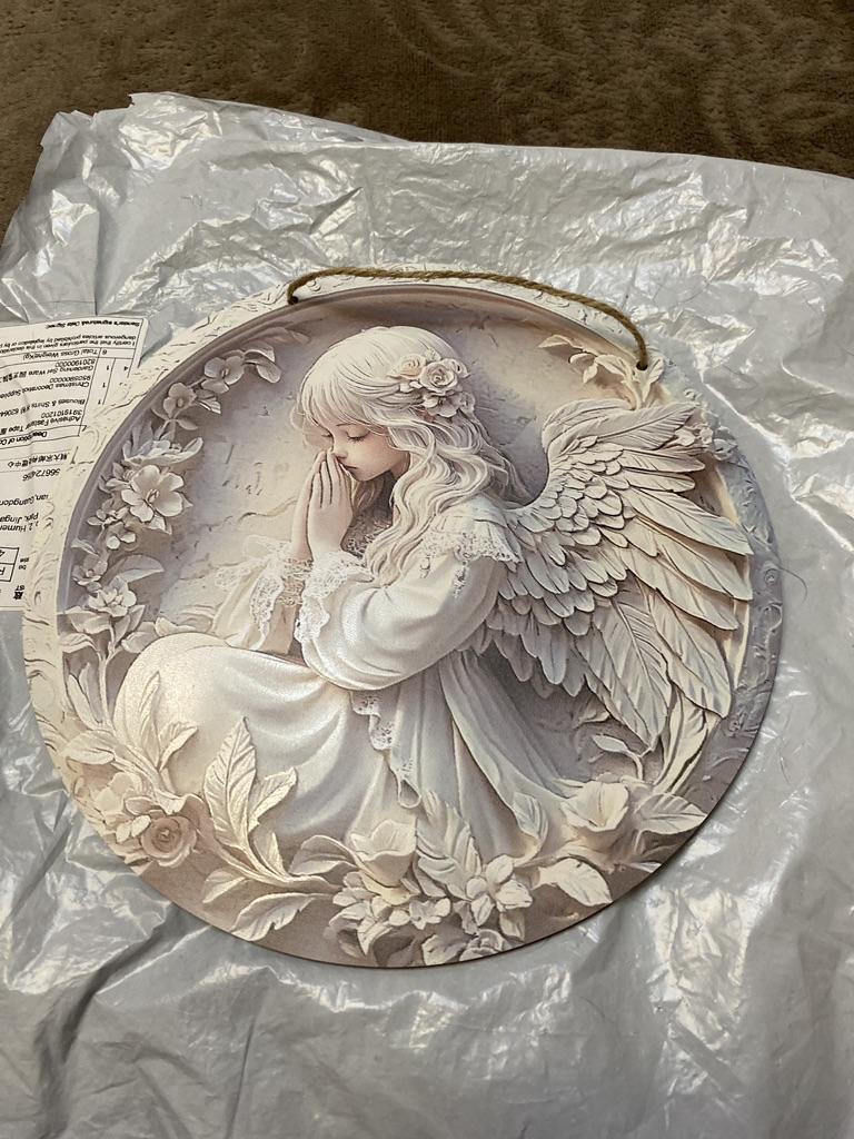2D Flat Hvitvinget Engel Treveggkunst, Engel Bønn Krans Hengepynt til Hjem/Kirke, Elegant Engelpynt til Dør, Vindu eller Rom