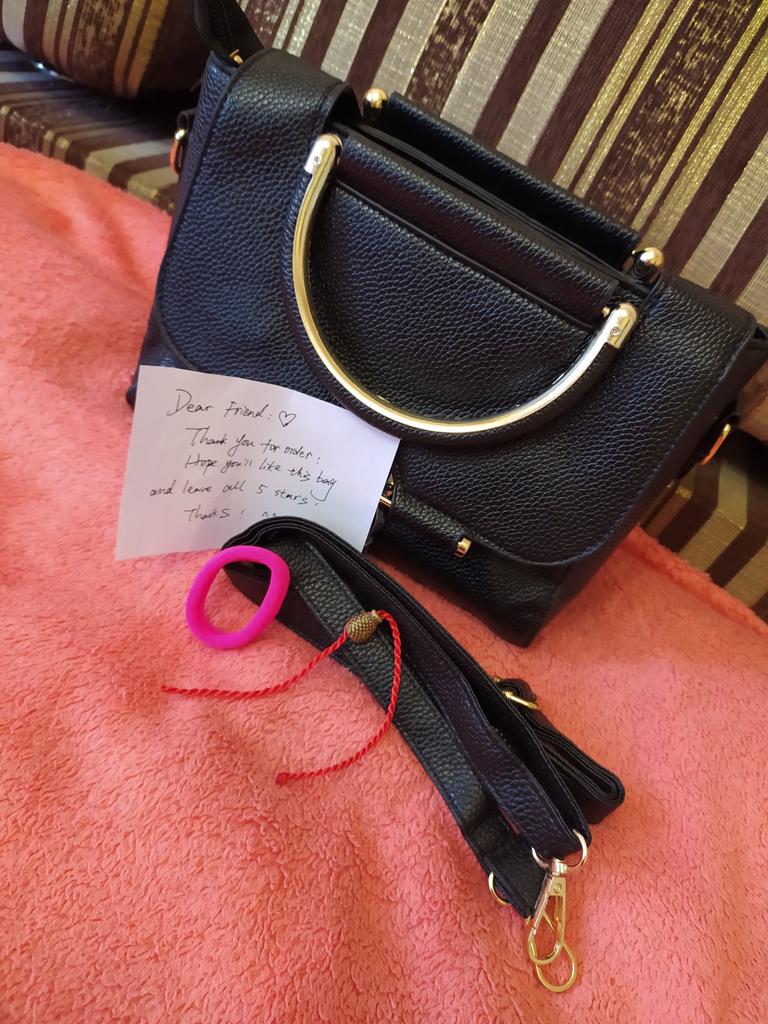 Сумка не большого размера, но вместительная. Пришла быстро. Немного помятая, но не критично. Внутри был пакет с воздухом. Внутри приятный сюрприз - записка, резинка для волос и красная нить на руку. За это продавцу отдельное спасибо. Смущают золотые вставки на ручках. Они сделаны из пластмассы,которая не очень качественно покрыта золотой краской. Помимо этого все ок. Сумкой в целом довольна.