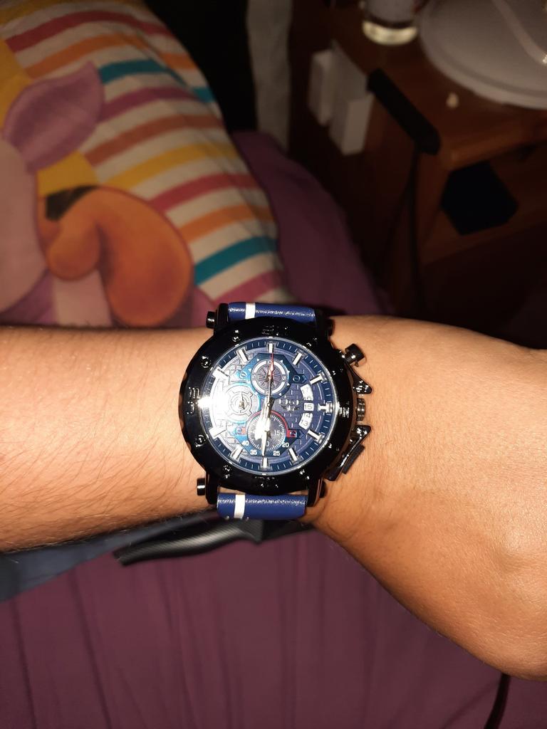 Lysande, vattentät, kronograf, kalender, stor urtavla, läderrem, mode, casual