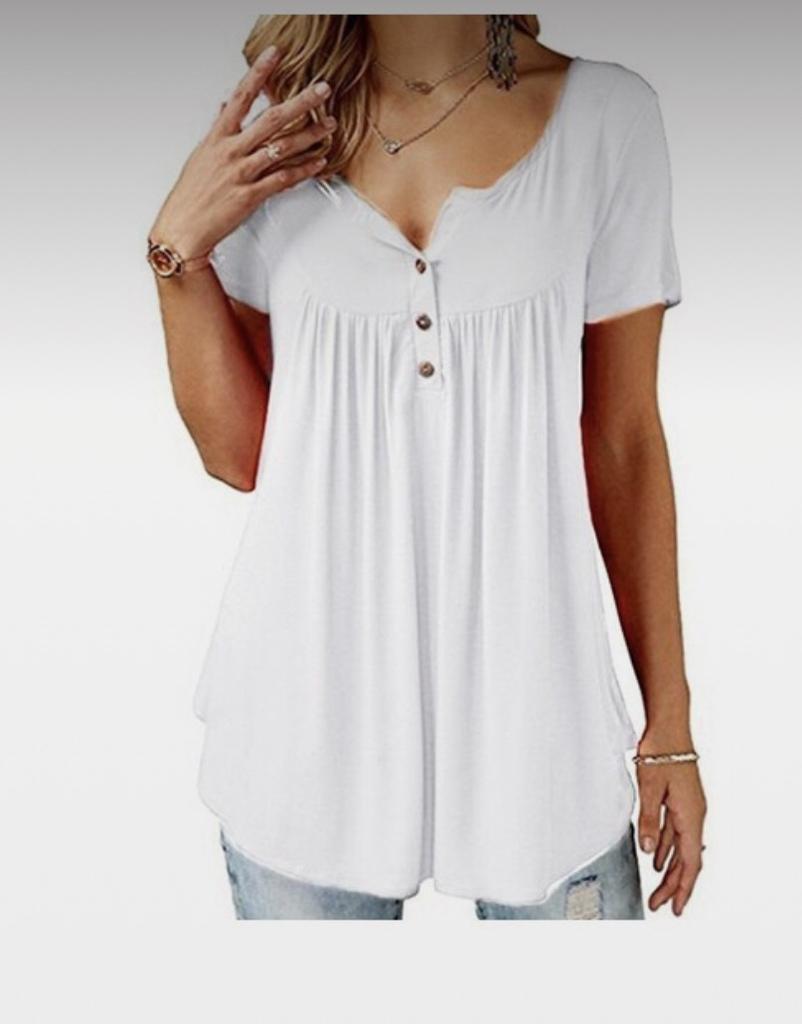 Denna eleganta tunika med v-halsringning och träffar i höftlängd, knappdetaljen erbjuder chic look samt en flexibel passform.
