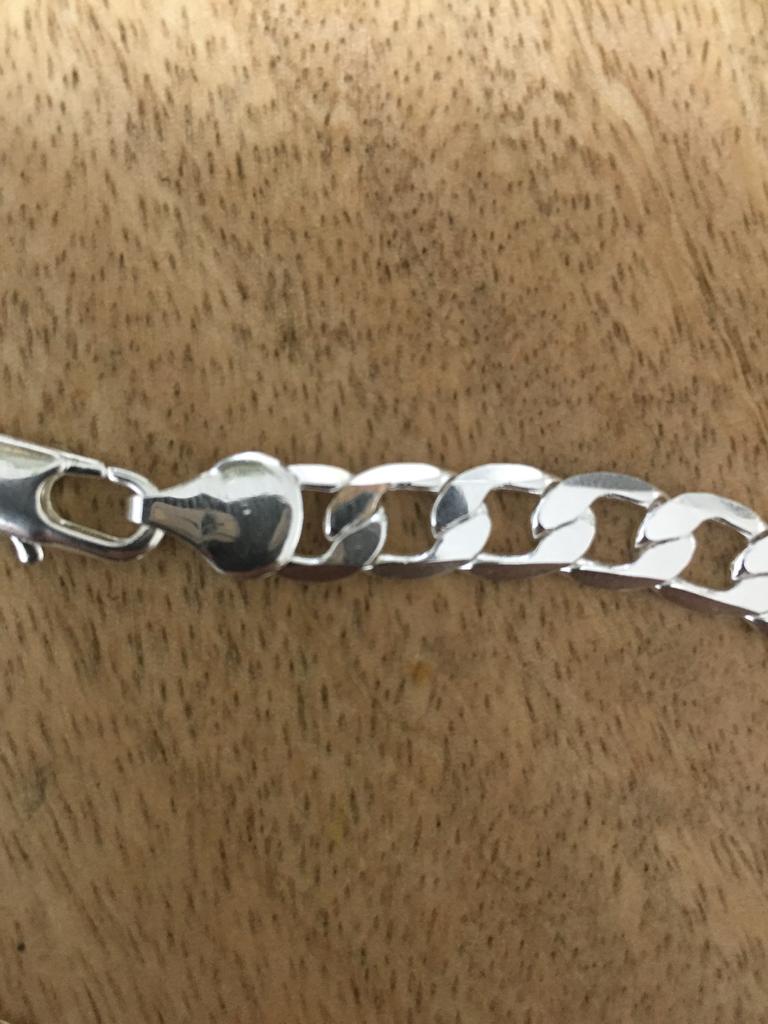 Inte riktigt silver. Den är silverpläterad. Förseglingen är felaktig. Jag kollade upp det på en guldsmedsbutik