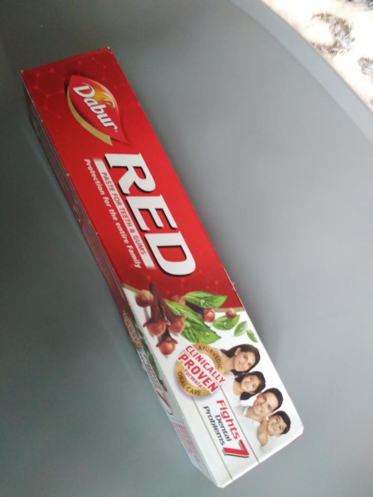 Ingredients: Calcium carbonate, Sorbitol, Aqua, Hydrated silica, Sodium lauryl sulfate, Herbal extracts of clove, mint, camphor, black pepper, long pepper, ginger, cinnamon, red ochre, preservatives, flavour