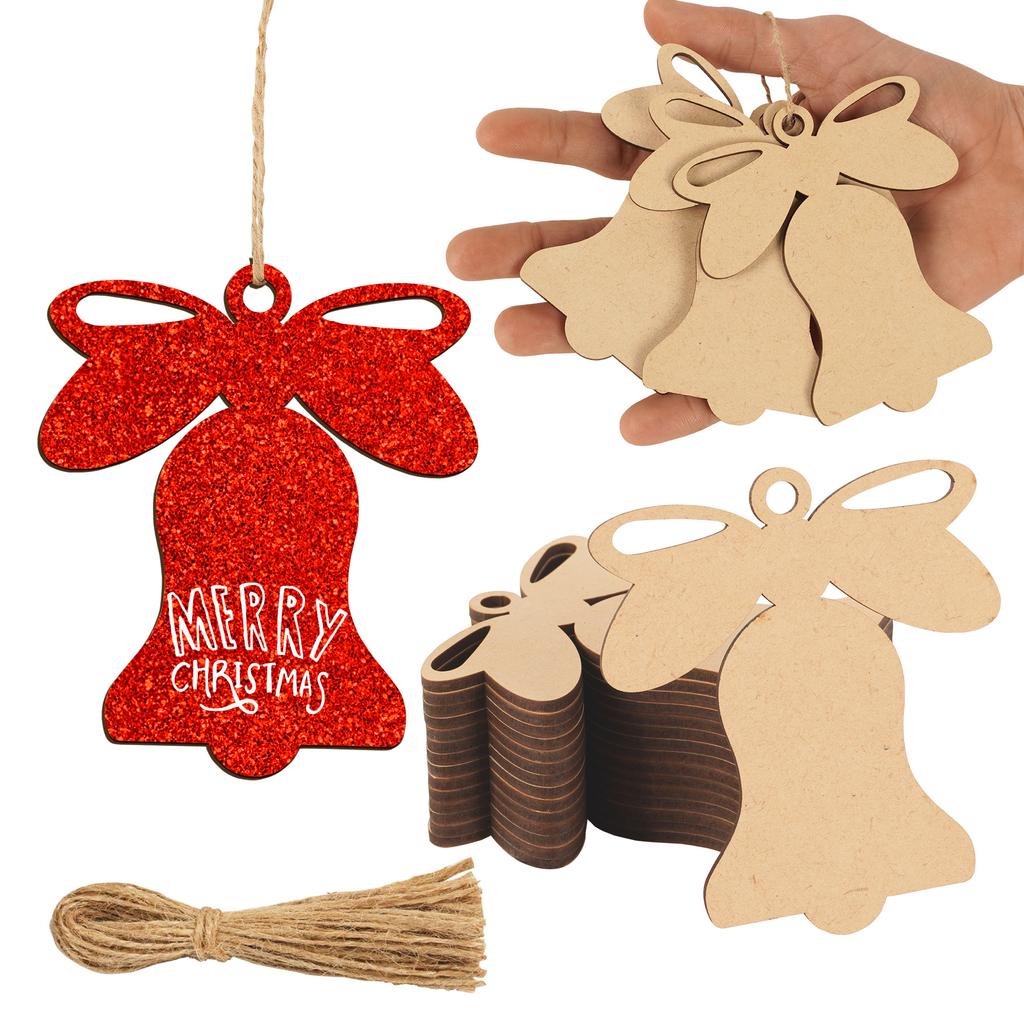 Inkdotpot 40pcs Bell Wooden Ornament with Holes 3.5" Unfinished Predrilled Natural Wood Slices for Crafts Wooden DIY Christmas Ornaments Hanging Ropes