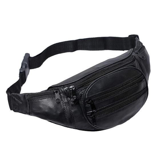 NOORA Stylish Real Leather Black Waist Bag Elegant Style Travel Pouch Passport Holder with Adjustable Strap