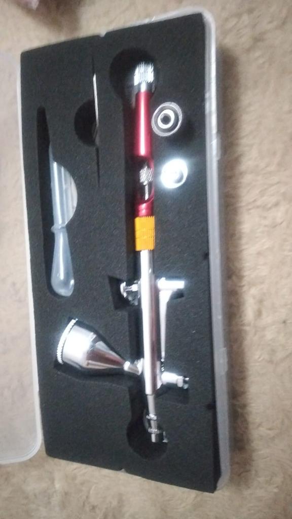 Levereras med en airbrushhållare, en dropper och en mininyckel.