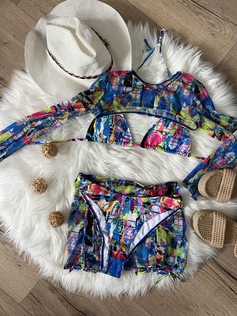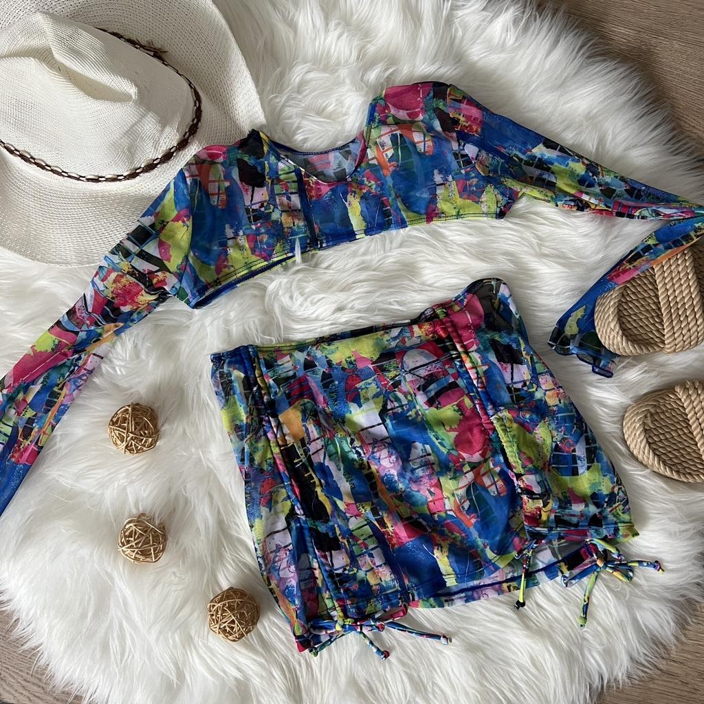 Baddräkt dam, delad tredelad uppsättning hög midja, dragsko med långärmad o-hals, snörning bikinidräkter