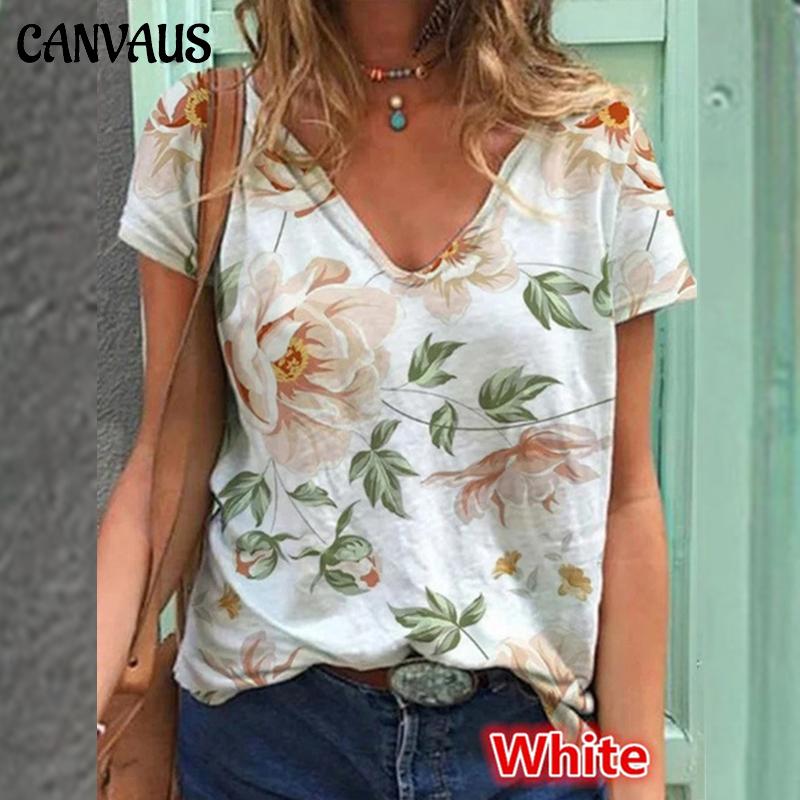 V-ringad tröja med blommönster med kort ärm i flerfärgad lös T-shirt för kvinnor