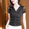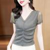 Elastisk Mesh-topp sommar Damskjorta med plisserad botten i briljant siden Slim Fit T-shirt för mamma