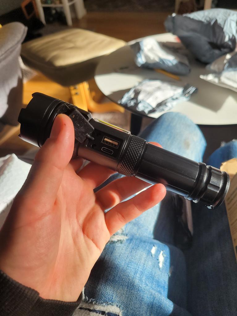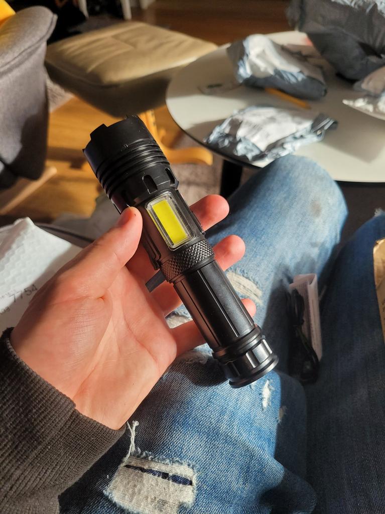 Jag är otroligt nöjd med, denna ficklampa. Man behöver inte sätta i batterier, det är en uppladdningsbar ficklampa utan batterier. Den har olika ljus, man kan zooma in och ut. Man fick laddningssladd till, dessutom så var den fulladdad redan när jag fick den. Mycket bra och otroligt nöjd, är jag med denna ficklampa också.