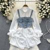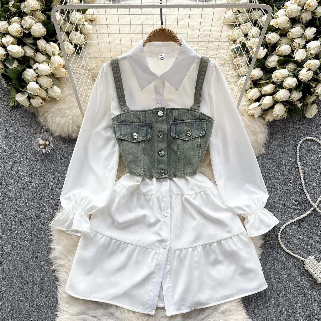 Koreansk Seriekläder Återupplivande Tvådelat Set Topp Retro Kort Jeansväst Trendigt Allmatchande Mellanlångt Skjortset