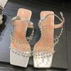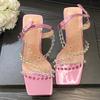 Mode Rosa Ankelsko Konstiga Höga Klackar Fest Bröllop Strass Sandaler För Kvinnor Fyrkantig Tå Pvc Genomskinliga Skor