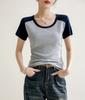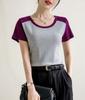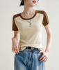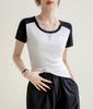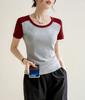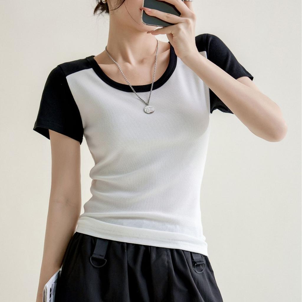 Cool Rundhalsad Smal Bomulls-T-shirt med Gängad Kontrastfärg för Kvinnor 2024 Vår och Sommar Ny Högelastisk Inre Smal Topp