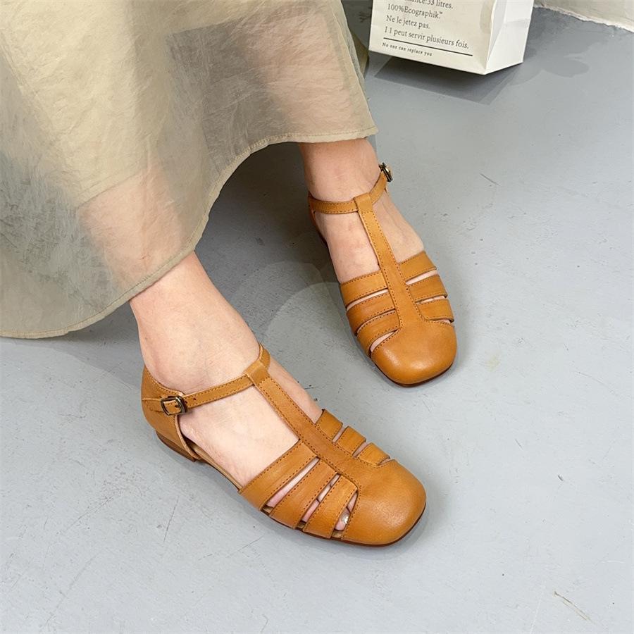 Johnature Handmade Genuine Leather Sandals Versatile Round Toe Buckle Strap Cowhide Flat Women's Shoes