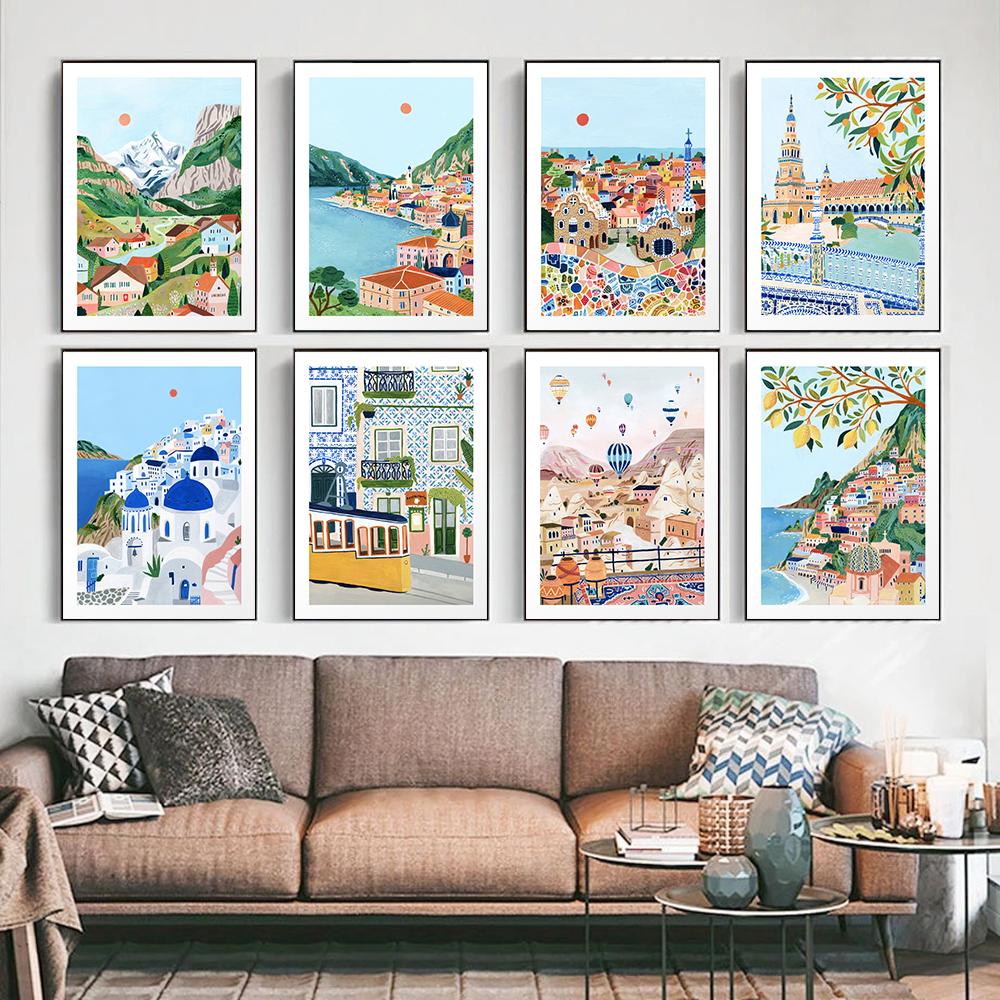 Nordic Positano Italy Vintage Posters and Print Santorini Barcelona Canvas Painting Gift Wall Art for Living Picture Home Decor