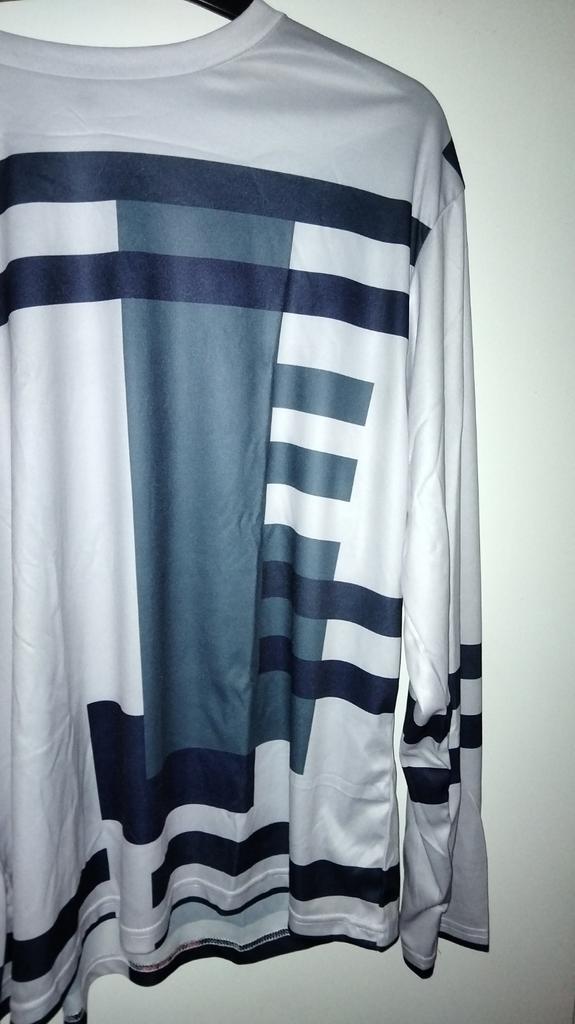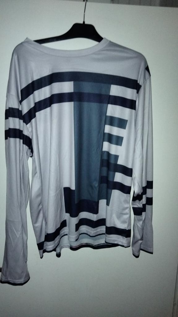 Dels är tröjan inte stickad, den är i "sportmaterial", och dels är den liten i storleken. Ärmarna var för korta, och tröjan för kort. Jag har normalt sett knappt L