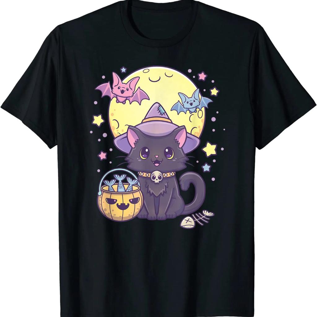 Kawaii Pastel Goth Cute Creepy Halloween Black Cat Witch Hat T-Shirt