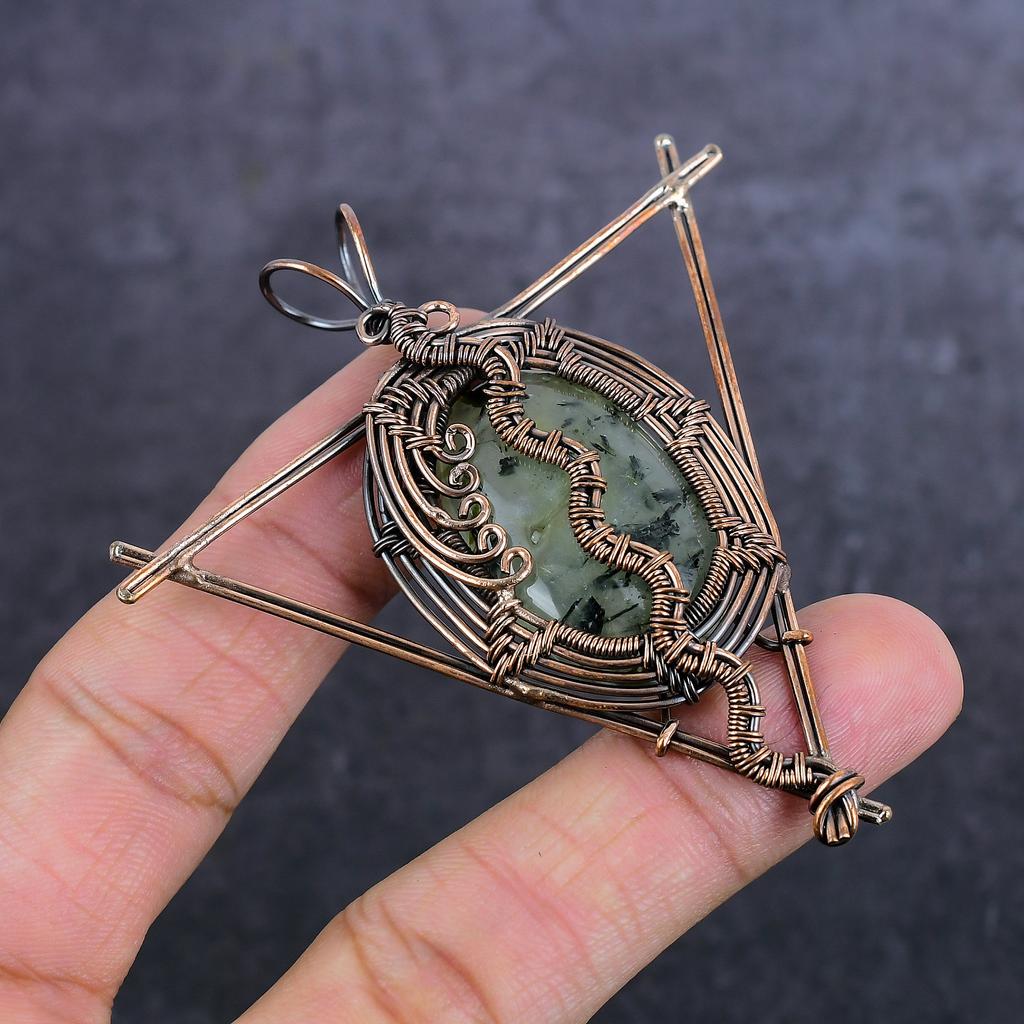 Naturlig Prehnit Ädelsten Handgjord Koppartrådsinlindad Smyckeshänge 2.96"