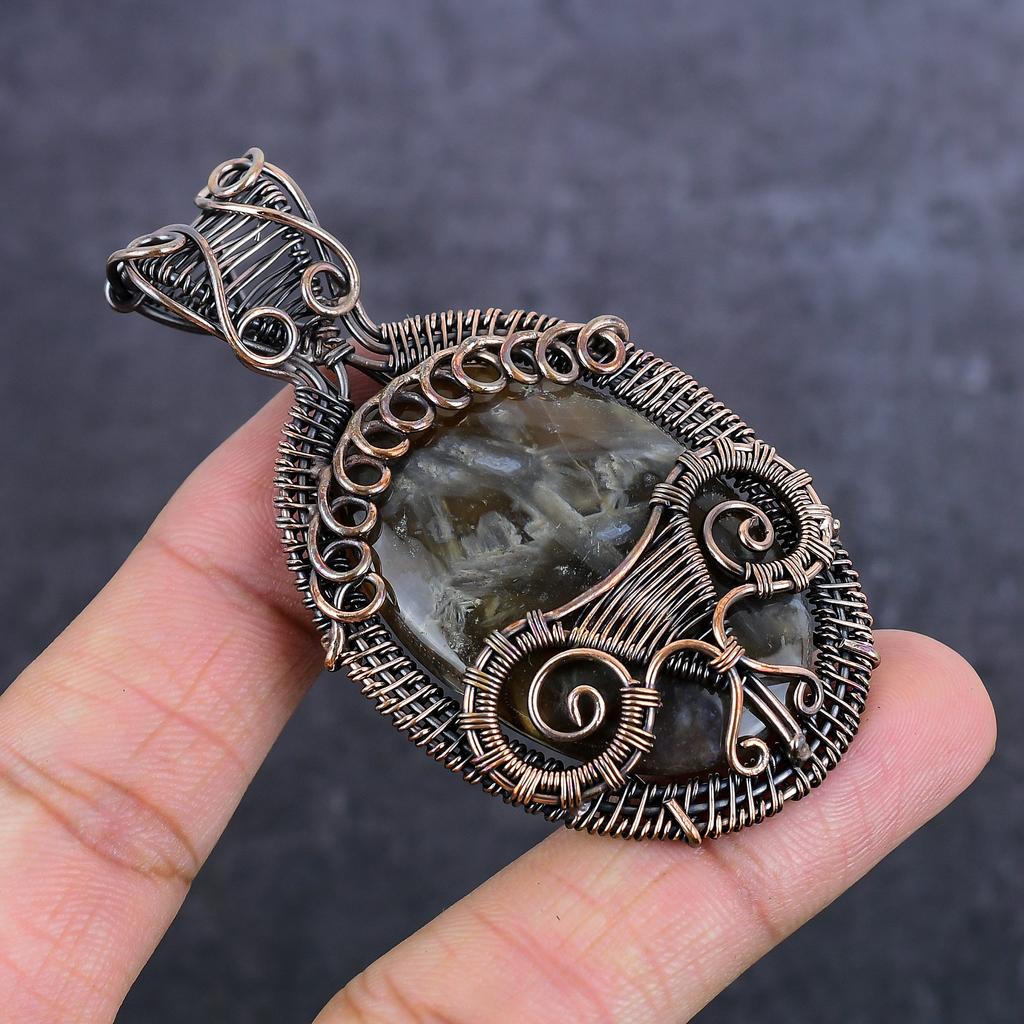 Naturlig Röragat Ädelsten Handgjord Koppartråd Wrap Smycke Hänge 2.96"